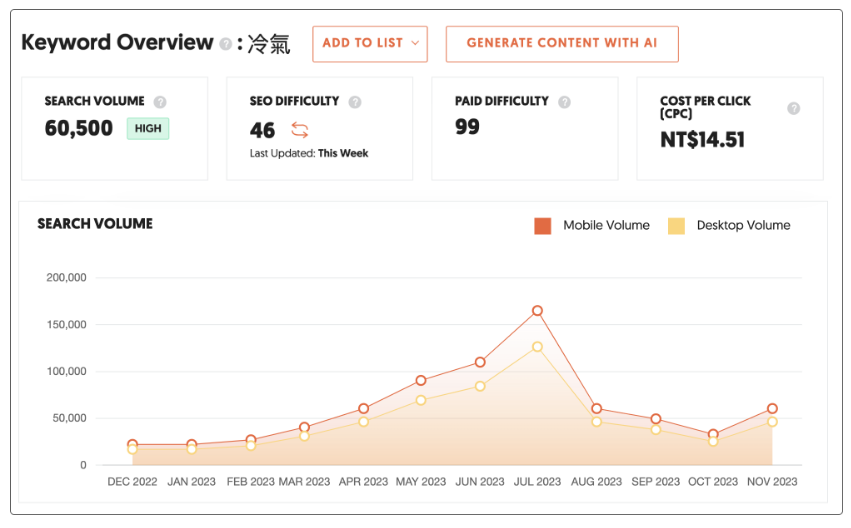 举例来说,「火锅、姜母鸭、温泉」的搜索量高峰一定是冬天,夏天则是「防晒、冷气、刨冰」相关的关键词才会有较高的搜索量(如上图)。