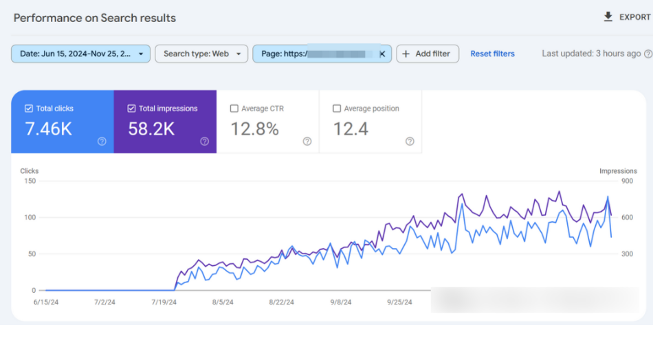 第二个例子:今年8月初上线的新文章,最初两个月表现平平,但在10月10日之后,排名和流量才有显著增长。如图: