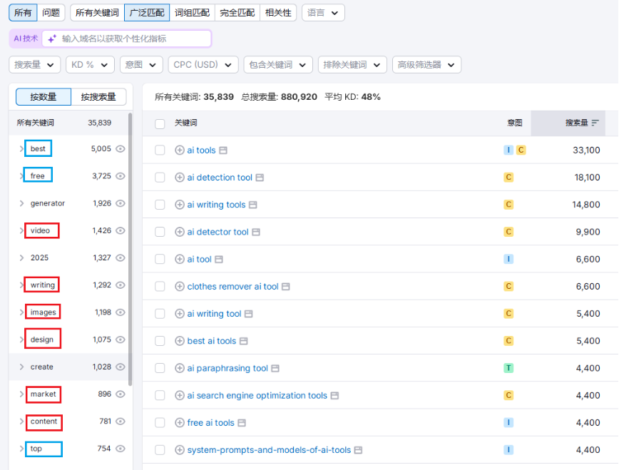 比如:SEMrush这个工具,我们只需要检索一下:ai tools和ai tool这两个词,就可以得到如下相关分类结果。如图: