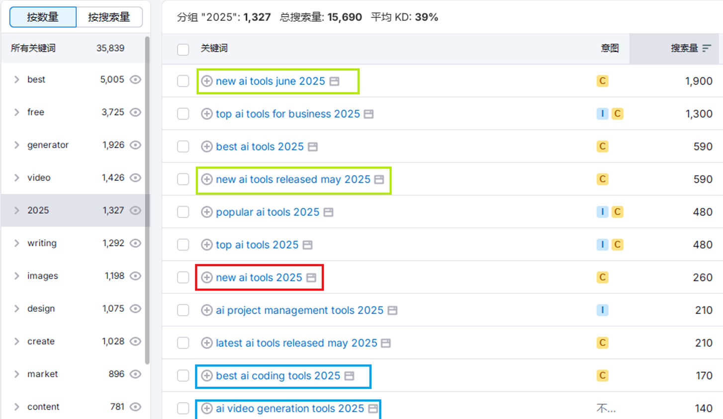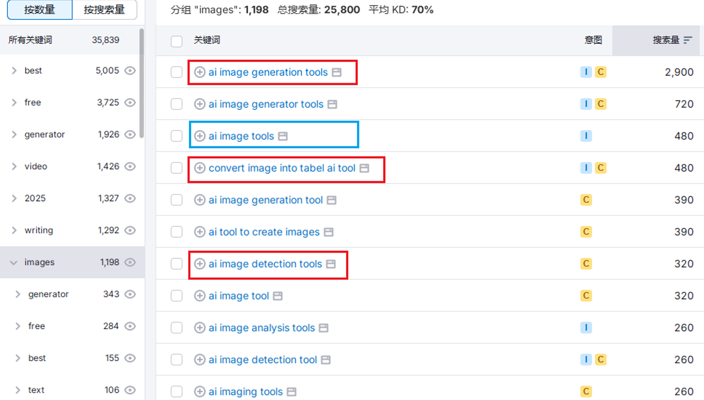 这样我们就合理的整理出与2025 ai tools相关性的专题页面词库与板块分类,为后续运营打下基础。