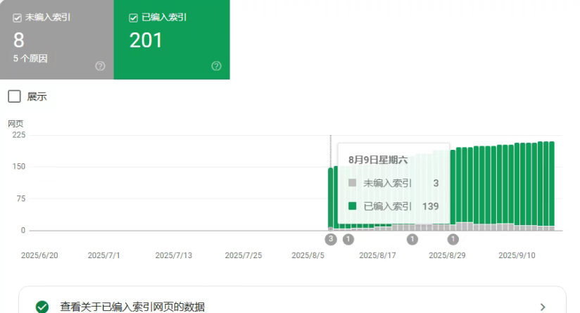 截止:9月18日,页面索引量201个,8个页面未被索引。