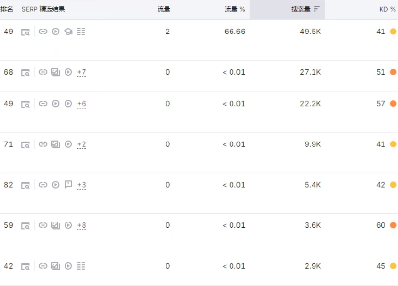 我们可以优选KD难度比在60以下,搜索量50K以下的关键词,排名起来相对会容易一些。