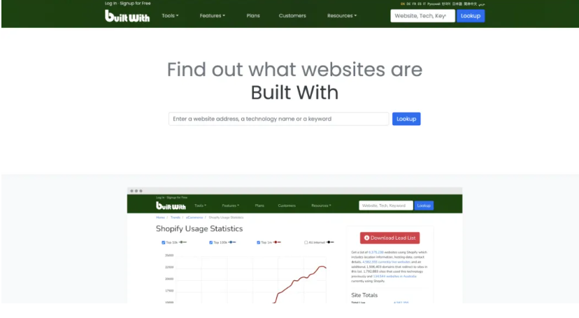 首先跟大家分享下这个平台是干什么的。举个例子,当你想知道有多少个网站在用shopify建站的时候,你可以在这个网站上输入shopify,他会自动查询网络上使用了shopify搭建网站的网站,并且给你一个具体的列表,让你一个一个查看。如图: