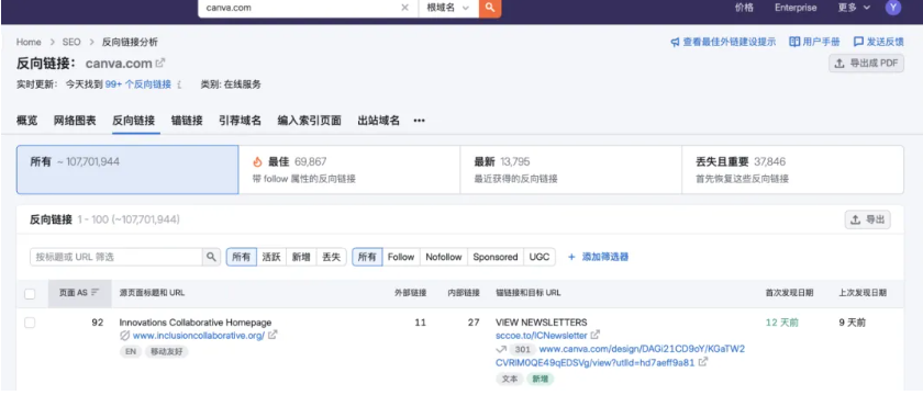 这个的思路和semrush类似,打开我在文章开头给的链接之后,输入你竞争对手的域名,点击check,就会弹出下面图片这样的窗口,里面都是这个网站的外链,同样我们看左侧那一栏就好,右侧依旧是这个网站都在这个能做外链的网站上给他自己哪些页面做了链接。如图: