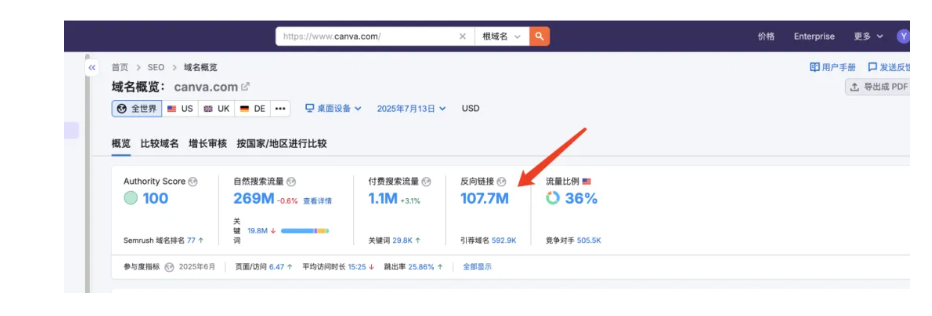我们做网站的同时,肯定会有一帮竞争对手,跟我们一样去竞争同一个关键词。你可以挑几个你认为做的还不错的,搜索排名靠前的,把它们的网址粘贴到semrush中然后你会看到右侧有一个反向链接的字眼,我们点进去。如图: