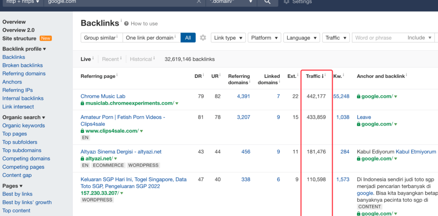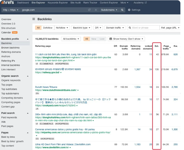 我使用的是Ahrefs工具,下面是导出链接异常的一些外部网站的截图。在下图中,Ext.(Shows the number of external links from the referring page.)就是导出的链接数量。如图:
