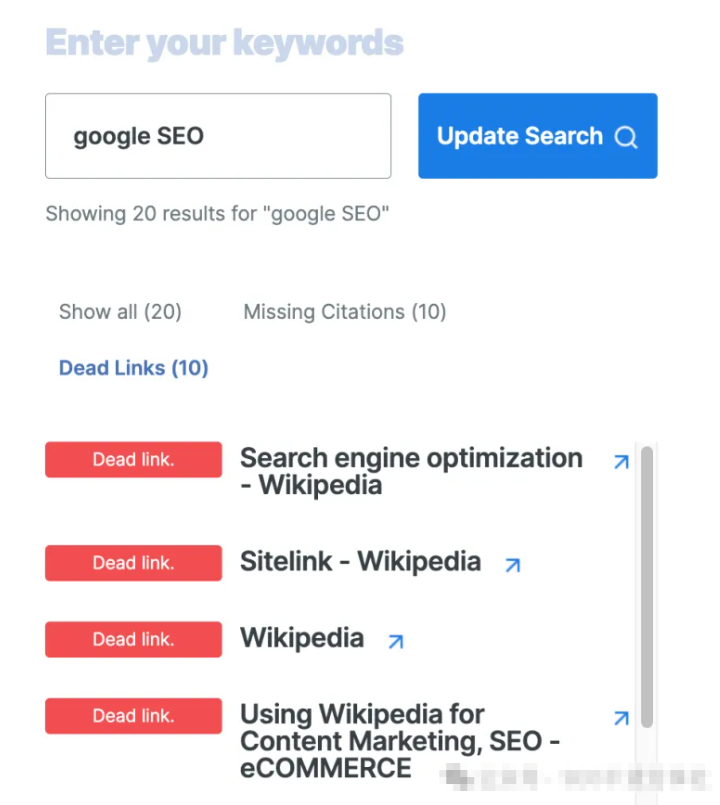 在搜索框中输入关键词“谷歌SEO”,该网站会返回维基百科中的一些相关页面列表,这些页面需要添加引用或存在死链接。