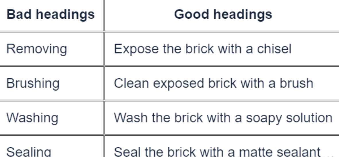 例如,假设您编写了一份关于从砖墙上去除石膏的指南。在左侧,是我们未搜索优化排名的搜索关键词。我们是以这种方式去书写,那它们永远不会进入 SERP排名。而在右侧,是我们修改优化后,有信息量更大的标题,Google 可以使用这些标题来回答稀缺性的用户搜索作为结果展示。如图