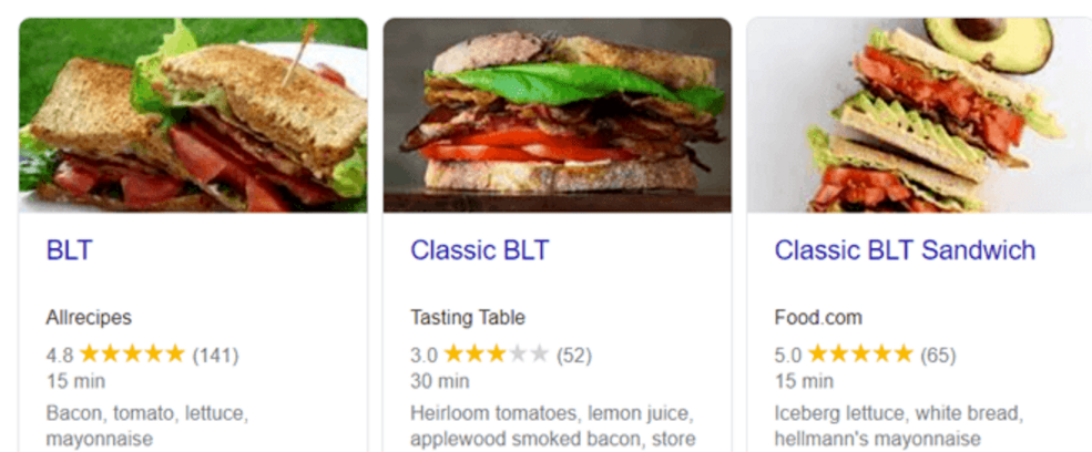 Schema 标记用于指出页面上的特定信息,Google 可以使用这些信息来创建丰富的摘要。例如,如果您将 Schema 应用于食谱页面,Google 将知道食谱的烹饪时间、成分、评论数量,甚至食谱的卡路里计数。它将使用这些信息来创建这些: