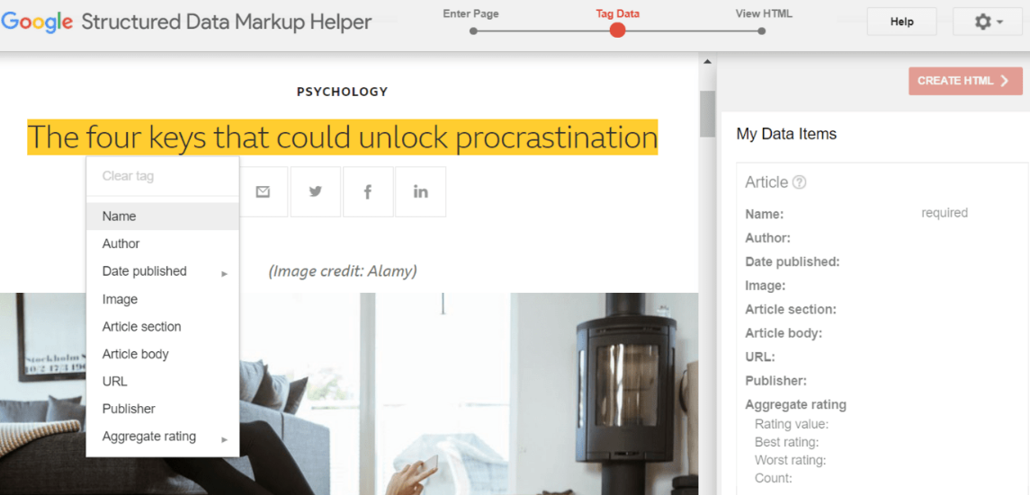 Schema 可能会变得有点复杂,而且它不是你可以手动输入的东西。将架构应用于页面的最佳方式是使用 Structured Data Markup Helper。在那里,您可以选择 Schema 的类型,输入您的 URL,然后只需选择页面上的文本并进行标记即可: